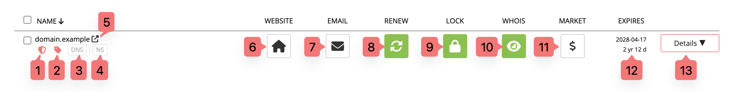 - Renew Domain: If you want to enable/disable auto-renew or just manually renew your domain, the renew icon in the middle of the row of icons is where you can quickly do it. Check out our guides: How to renew a domain and How to turn off auto-renew.