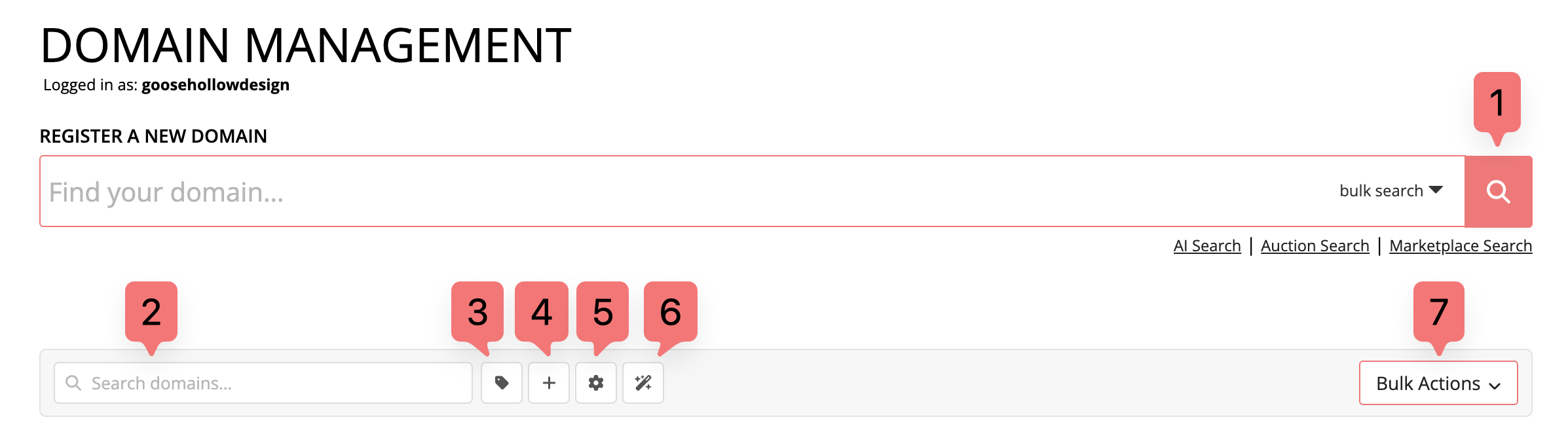 - Register a new domain: Looking for more domains to register? You can do so by entering the domain you are looking for in the bar below "REGISTER A NEW DOMAIN" and select the magnifying glass icon. You can also use our bulk search tool to search for multiple new domains to register at once!