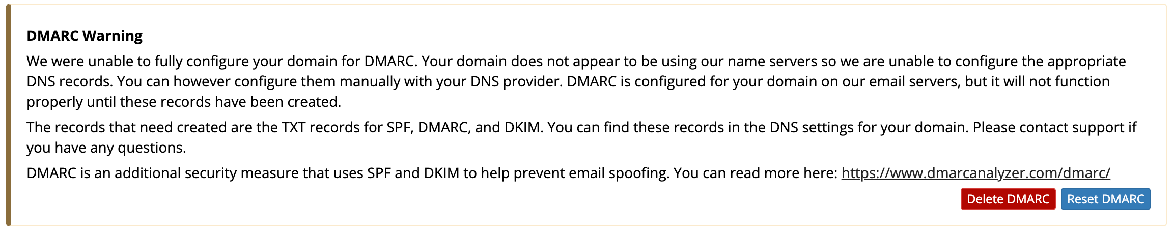 You may find that instead of a "DMARC Notice" section, you're shown a "DMARC Warning" section letting you know we aren't able to configure DMARC for your domain automatically: