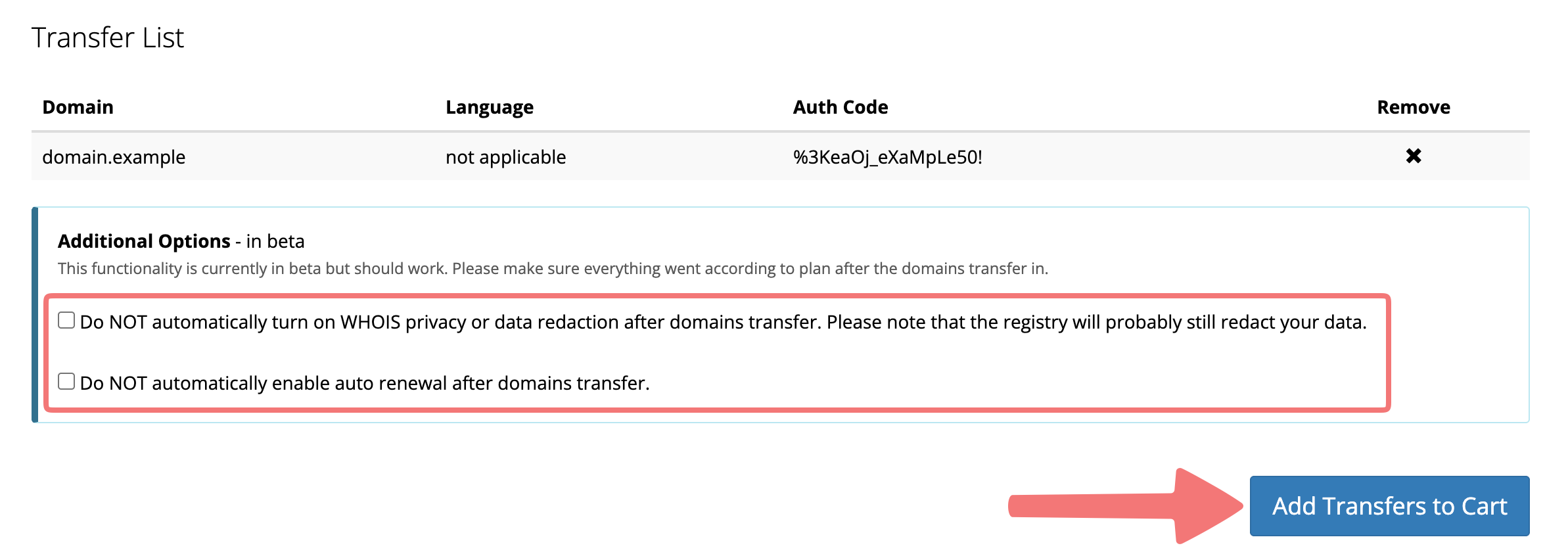 If you have an existing website, email service, or other DNS service set up on your domain, be aware that you might need to perform extra steps to ensure your site does not go down when the transfer completes. This guide explains more.
