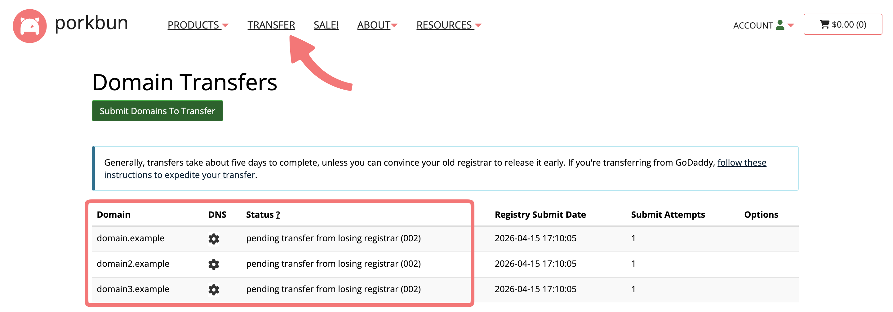 Now that you’ve initiated the domain transfer to Porkbun, it can take 5 to 7 business days to complete. Some registrars will expedite transfers out if you contact their support department once the transfer is in process, but not every registrar allows for this.