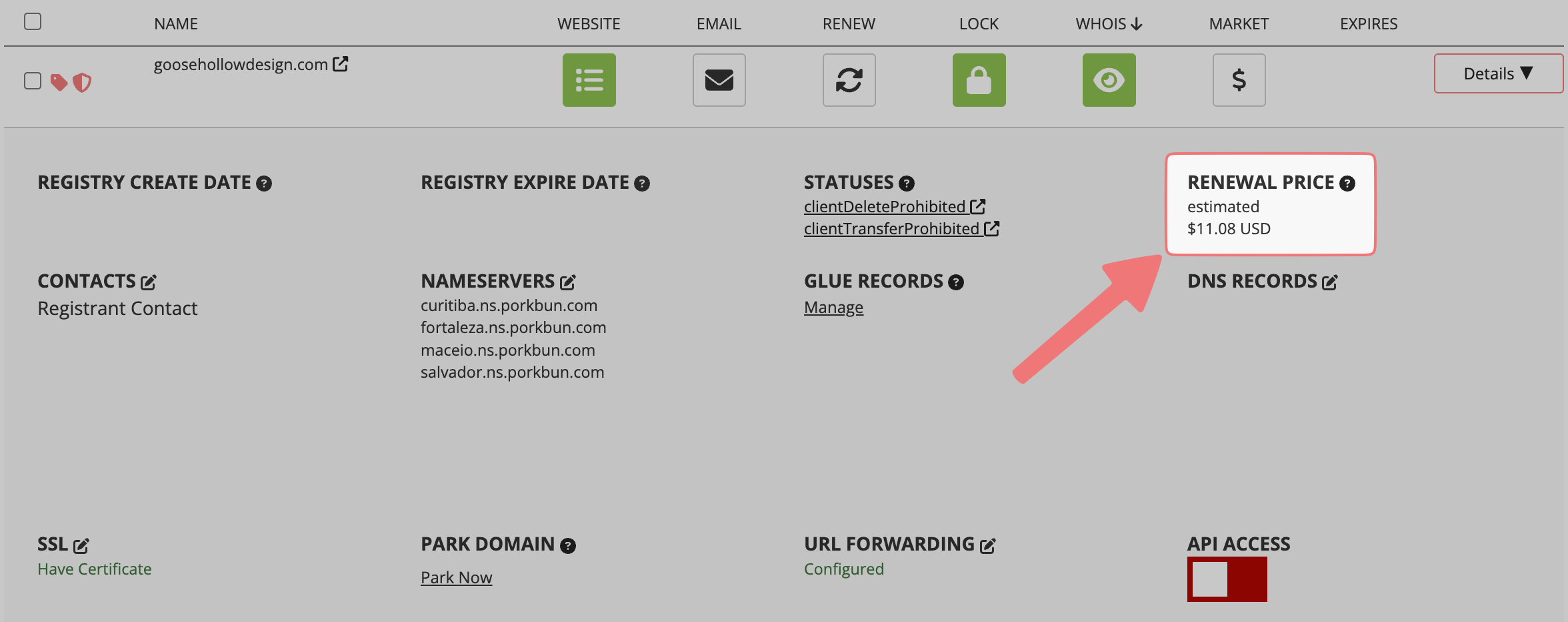 Finding a domain renewal price on Porkbun is easy. You can see all current domain name renewal prices on the Porkbun Domains product page. We also send out notices via email any time there is an industry-wide domain renewal price increase stemming from registry changes.