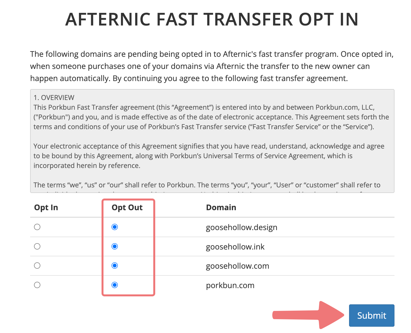 Next to each domain you're opting out, select the radio button under "Opt Out". Once you've opted your domain(s) out, click on the "Submit" button.