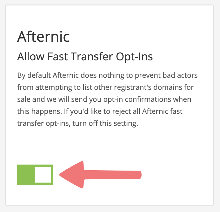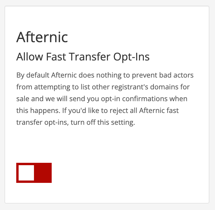 Scroll down to the "Account Security Settings" section and locate the option labeled "Afternic - Allow Transfer Opt-Ins". Click on the toggle switch to turn it red, disabling the setting.