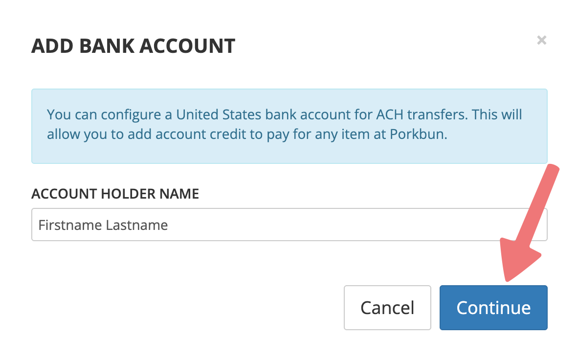 A window labeled "ADD BANK ACCOUNT" will appear. Enter the name of the account holder, then click "Continue".