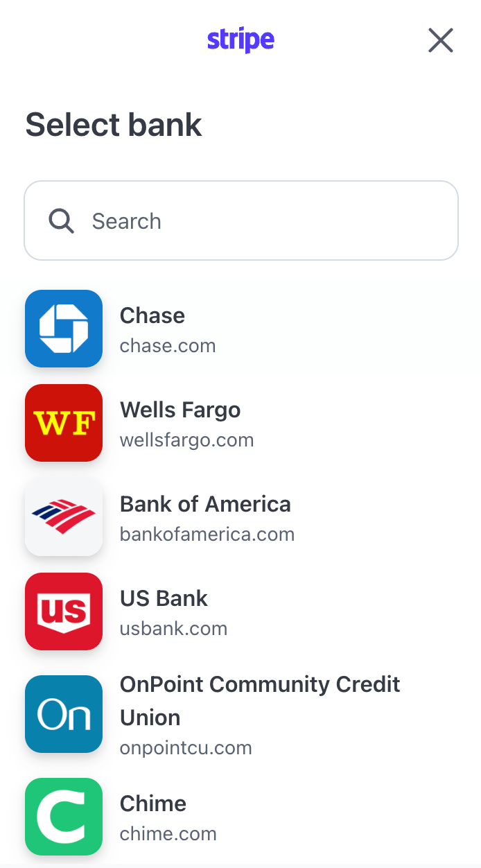 Next, you'll see a menu where you can choose the banking institution you're connecting to. Choose your bank from the list, or search for it with the provided search bar. After finding your bank, click on it to continue.