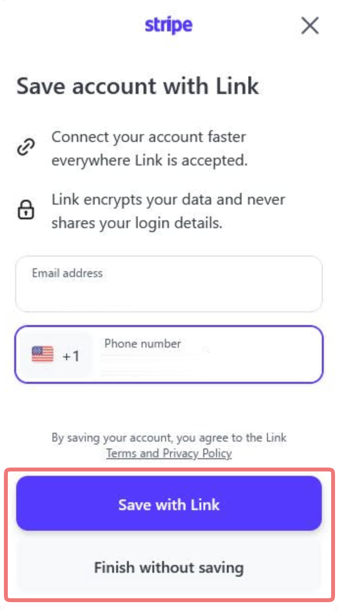 After verifying, you'll be given the choice to save your payment information with Link, which will allow you to save your account for use with other online payments that use the same system.