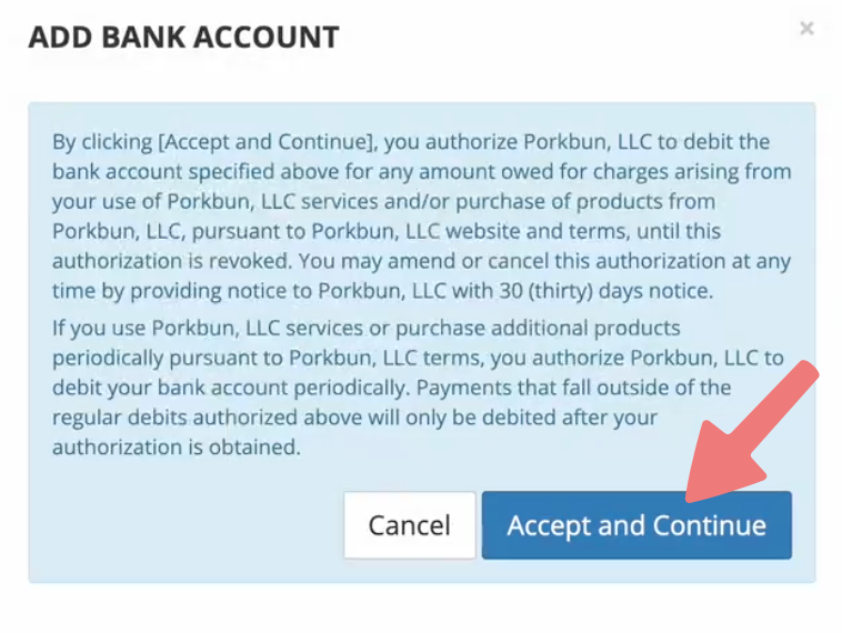Click on "Agree and continue" to authorize the connection between your bank and Porkbun.