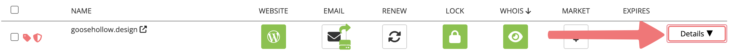Scroll down and locate the domain you are enabling DNSSEC on. Click on the "Details" button all the way to the right of the domain name to open the details menu.