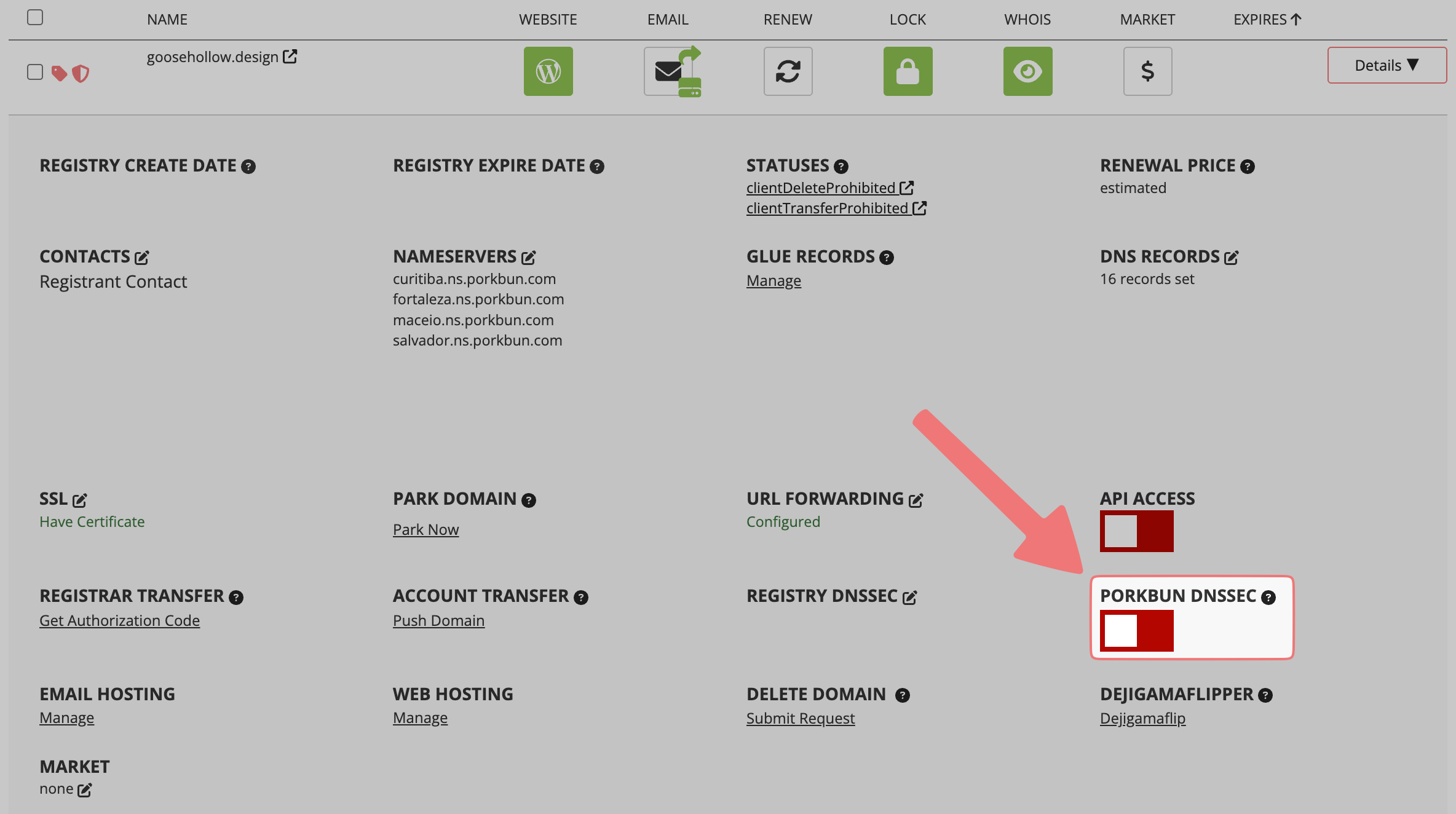 In the Details dropdown menu, find the option labeled "Porkbun DNSSEC". Click on the red toggle switch to enable the setting.
