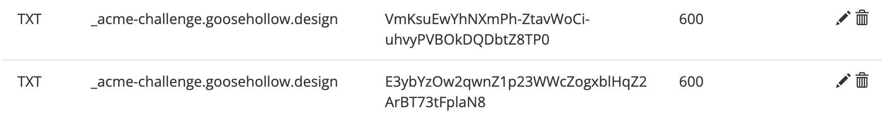 Having these records applied to your domain also makes it so the "wildcard" portion of your SSL certificate functions properly. This means that any subdomains you create on your domain (such as example.goosehollow.design) are also covered by our free SSL certificate automatically.