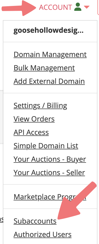 Log in to your parent account. While logged in, click on ACCOUNT in the top-right corner and select "Subaccounts" from the list.