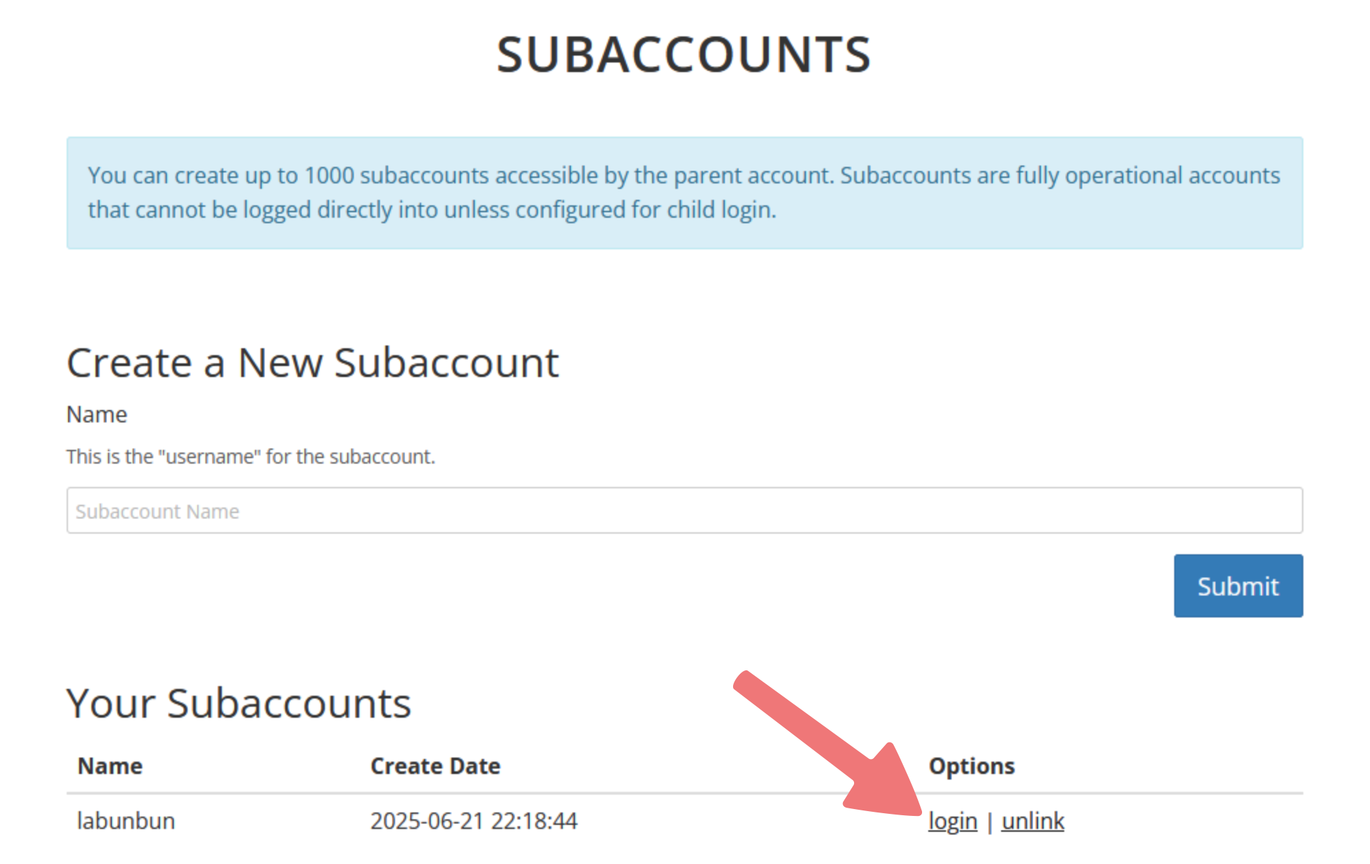 On the Subaccounts page, scroll down and locate the subaccount you wish to delete. Click on the "login" link to the right of the subaccount's name.