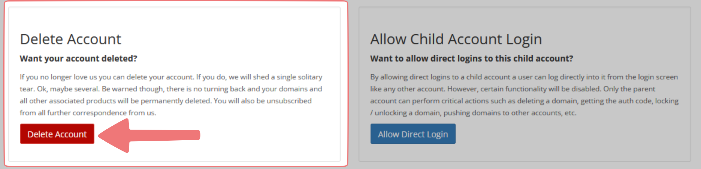 Review the information displayed on the "Delete Account Confirmation" menu. Again, if you have any domains in your subaccount, be sure to push them to your parent account before continuing.