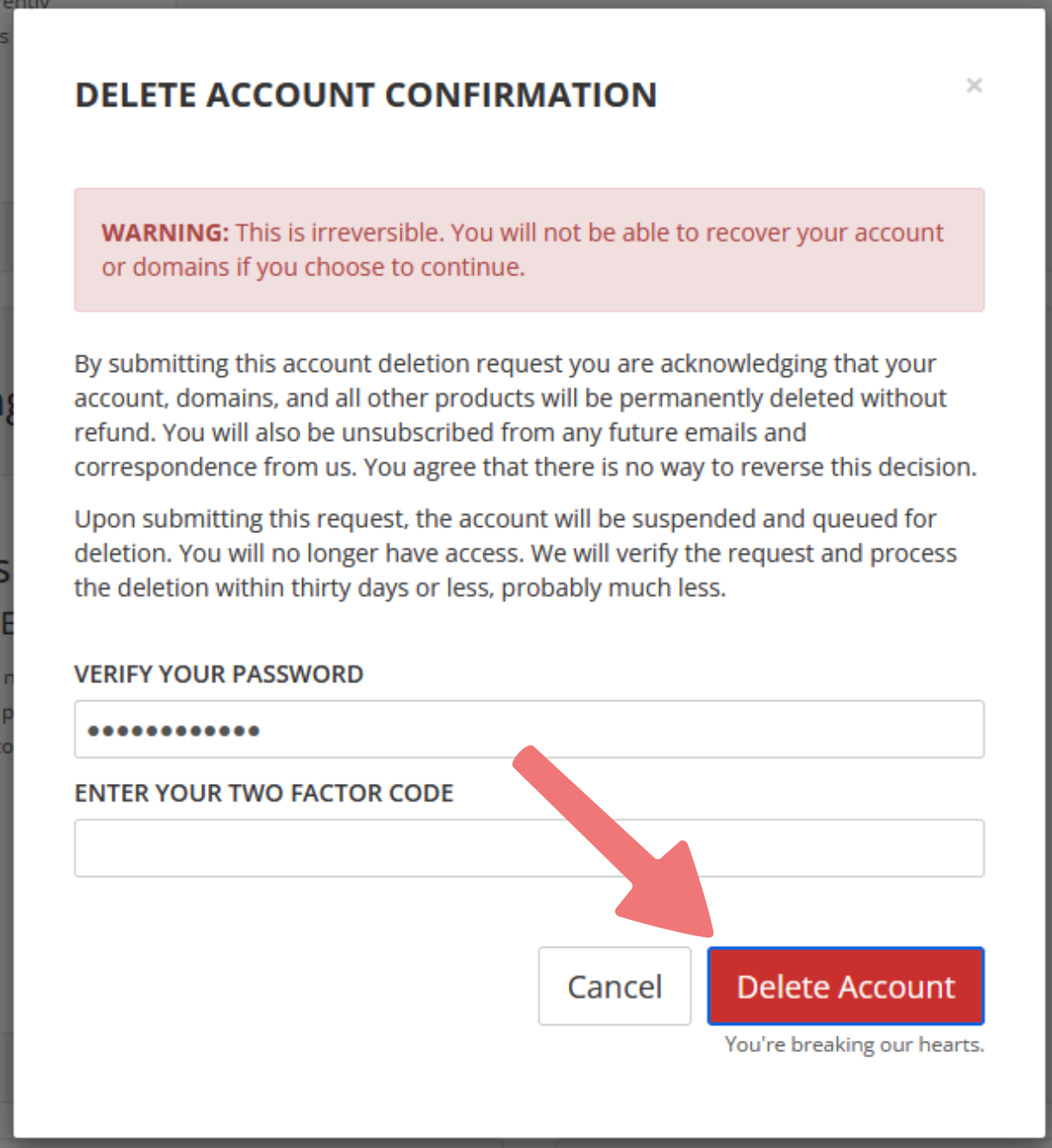If you have 2FA set up on your account, you will be prompted to enter your current 2FA code in order to confirm the deletion. Enter your 2FA code, then click on "Delete Account" again.
