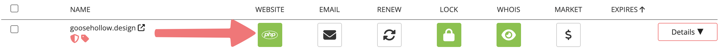 Locate the domain with the hosting plan you're looking to switch. To the right of the domain is a row of icons. Click the PHP icon that is the first option in that list, under the "WEBSITE" column.