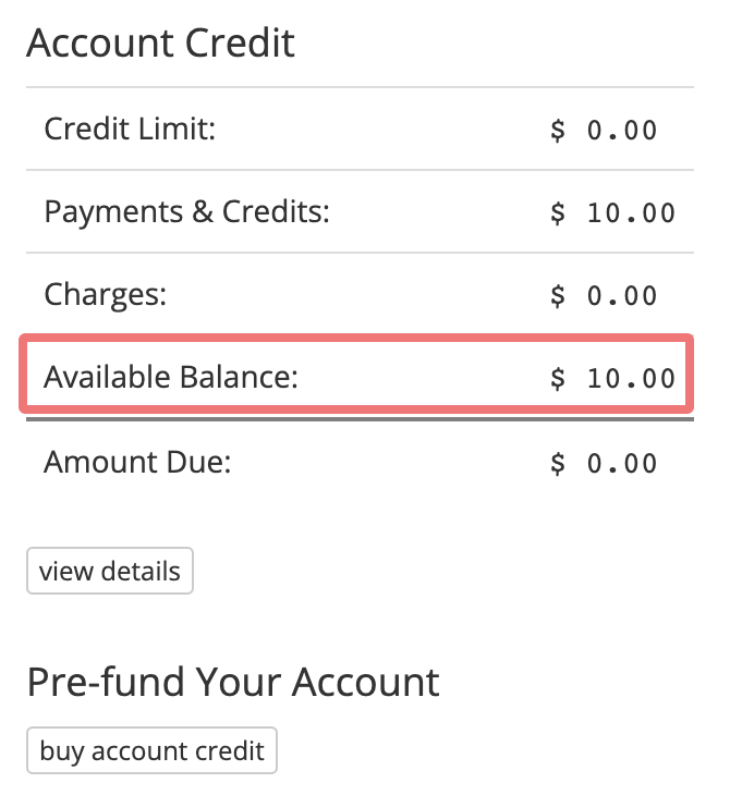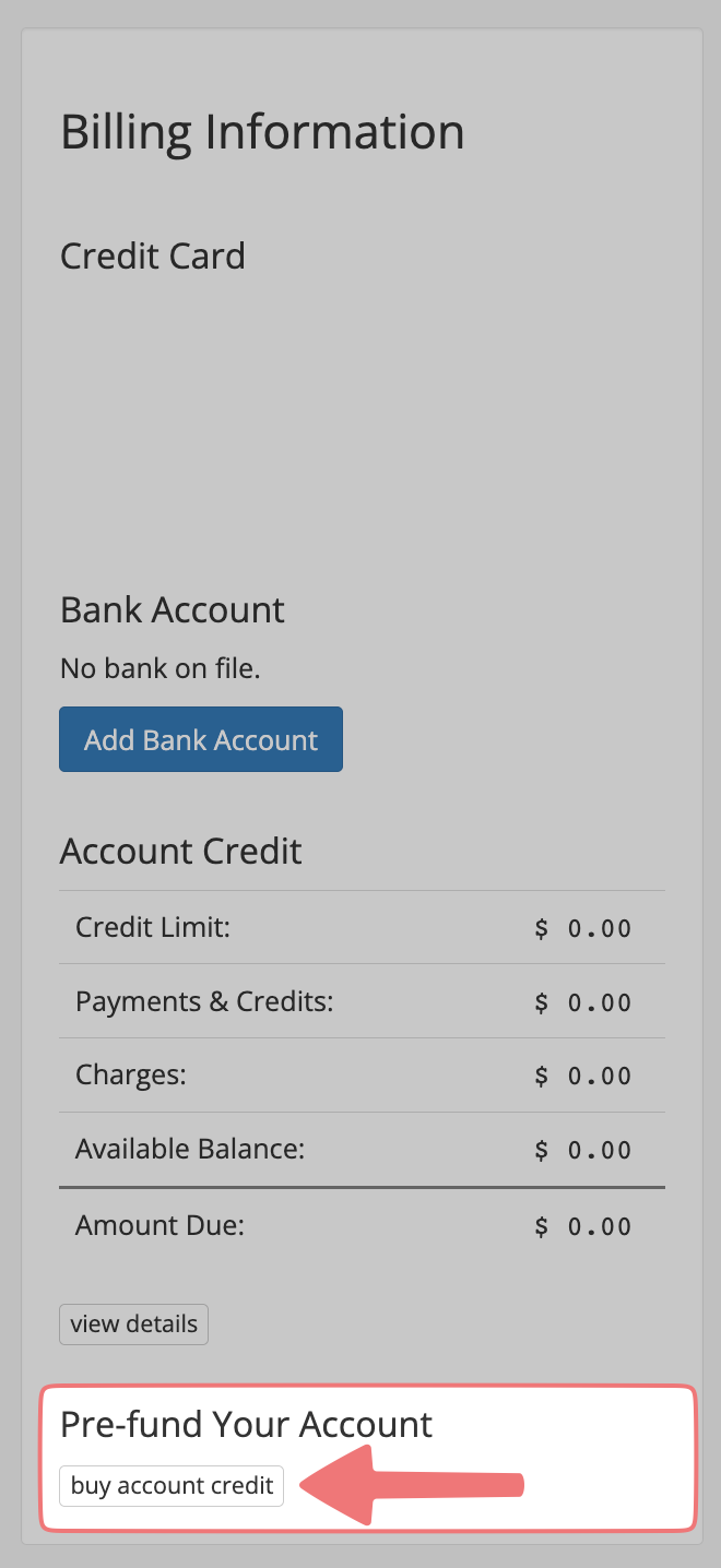 On the Settings / Billing page for your account, locate the "Billing Information" section. At the bottom of the section under the "Pre-fund Your Account" option, click on the button labeled "buy account credit".