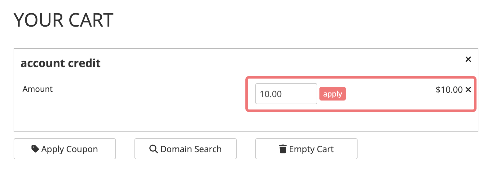 You'll be directed to your cart automatically. By default, you'll see $100 of account credit in the cart. You can adjust the amount of credit you're purchasing (there's a $10 USD minimum), then click "apply" to refresh your cart.