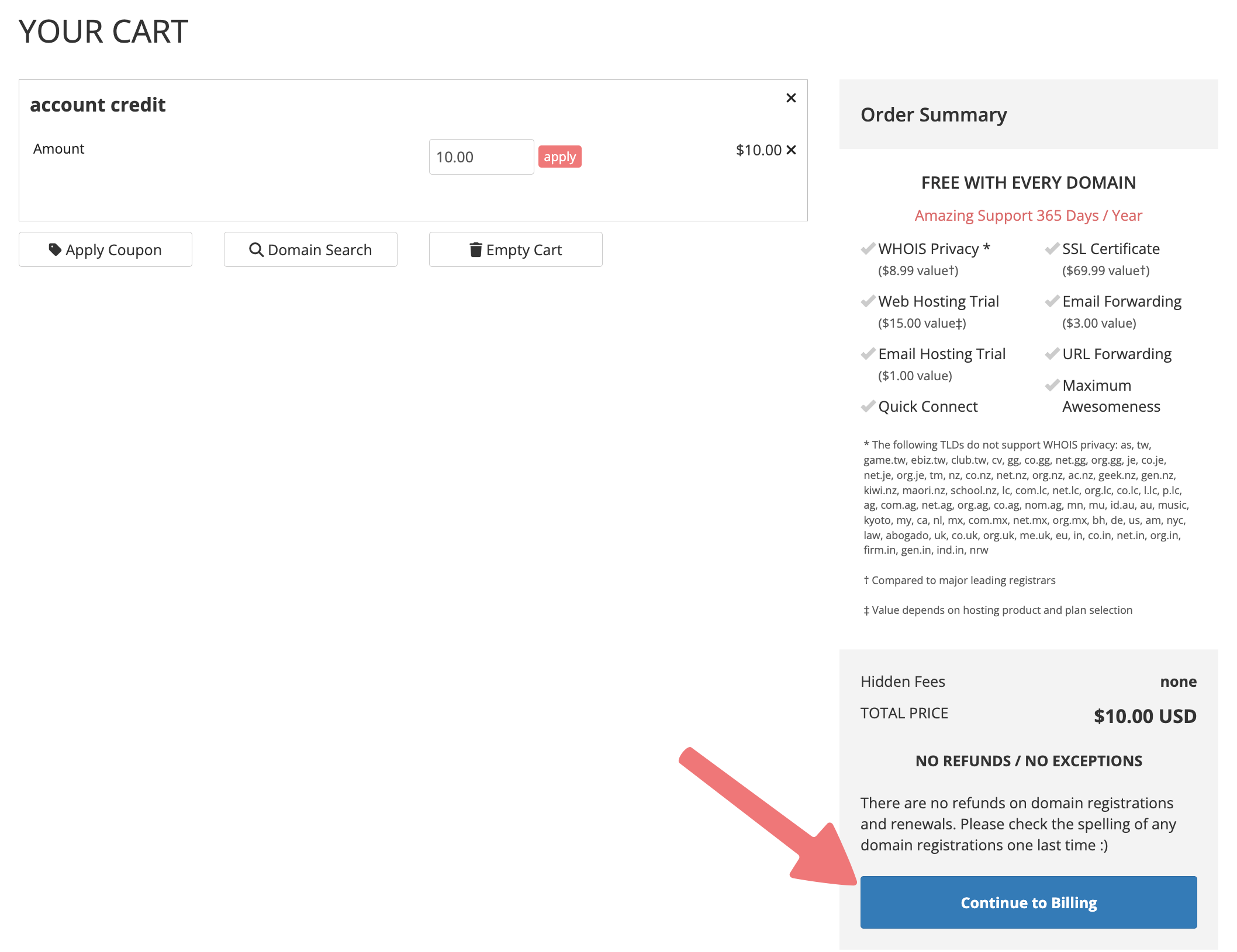 That's it! Once you've finished checking out, you can return to your Settings / Billing page to review your newly purchased account credit. This account credit can be used for future purchases at Porkbun, including automatic renewals.