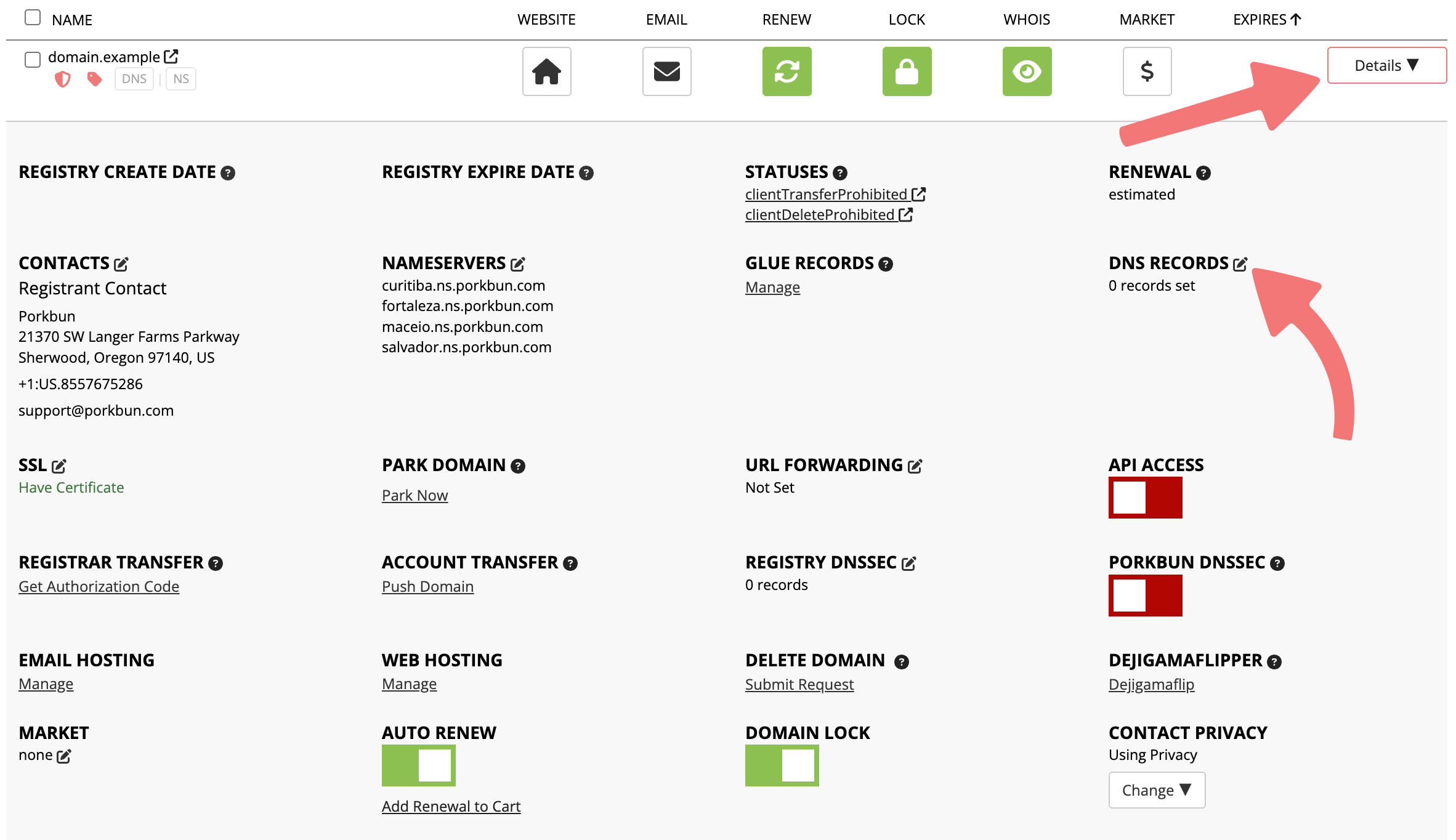 Locate your domain and click the "Details" button all the way to the right. In the Details menu that appears, locate the "DNS Records" option and select the edit icon.