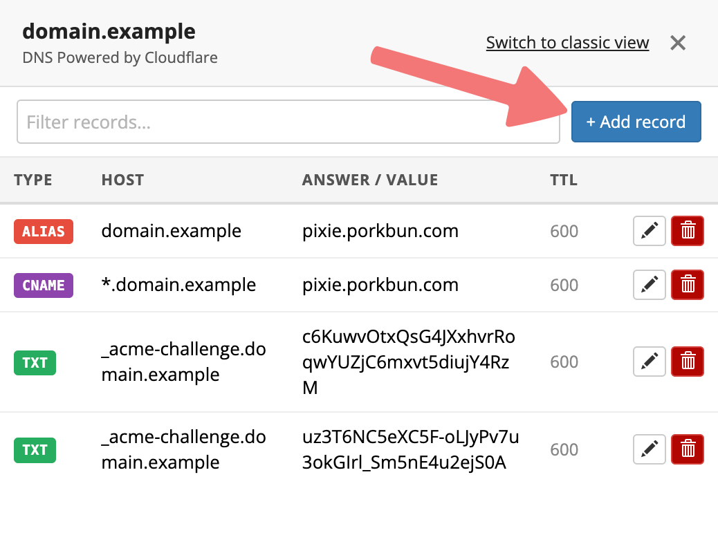Congratulations! You've learned how to edit the DNS records for your domain. The specific records you'll add and edit will depend on what service you're trying to connect your domain to. Most of the time, the provider whose services you're connecting to the domain (web host, email hosting provider, etc) will directly provide you with the records you need to add on Porkbun.