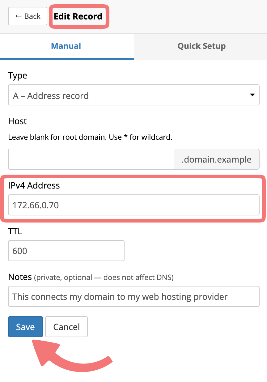 You'll see the DNS editing menu show up, which will allow you to edit the existing record. Make the changes you want to apply to the record, and once you're finished click on the save button.
